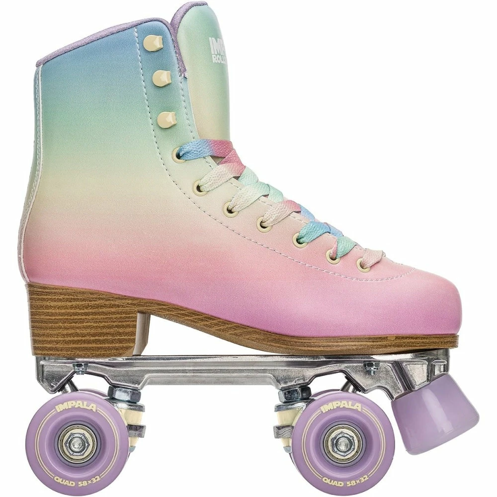 | IMPALA ROLLERSKATES PASTEL FADE IMPROLLER1-PASTEL FADE Rollerskates PASTEL FADE * PVC upper and heel/sole * Aluminium alloy truck and baseplate 58mm tall x 32mm wide highly * P.V. material brake stopper * ABEC 7 precision bearings * Nylon composite core for true bearing alignment * Metal speed lacing eyelets * PETA-approved vegan product |
