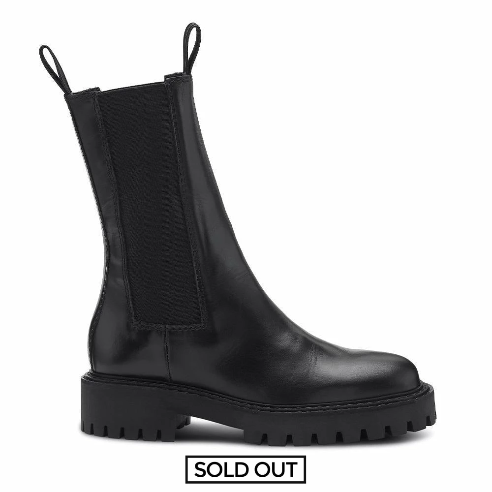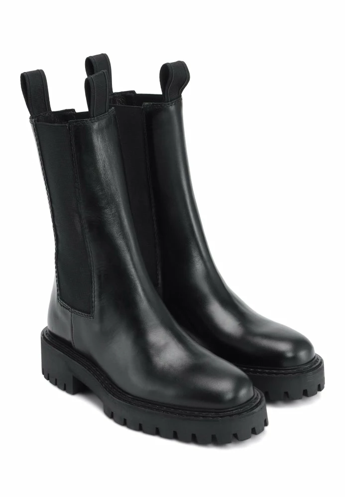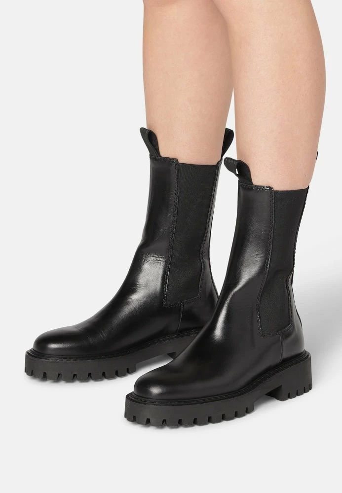 The additional strength comes with the leather lining and the heavy-duty military outsole made with 100% durable and long-lasting thermoplastic rubber with a double welt. These elegant ‘Angie’ boots feature a round toe, an elastic fastening on both sides, and come with a sturdy and smooth finishing on top in black color.