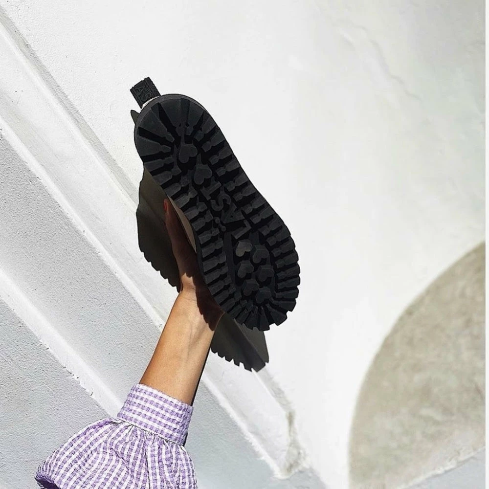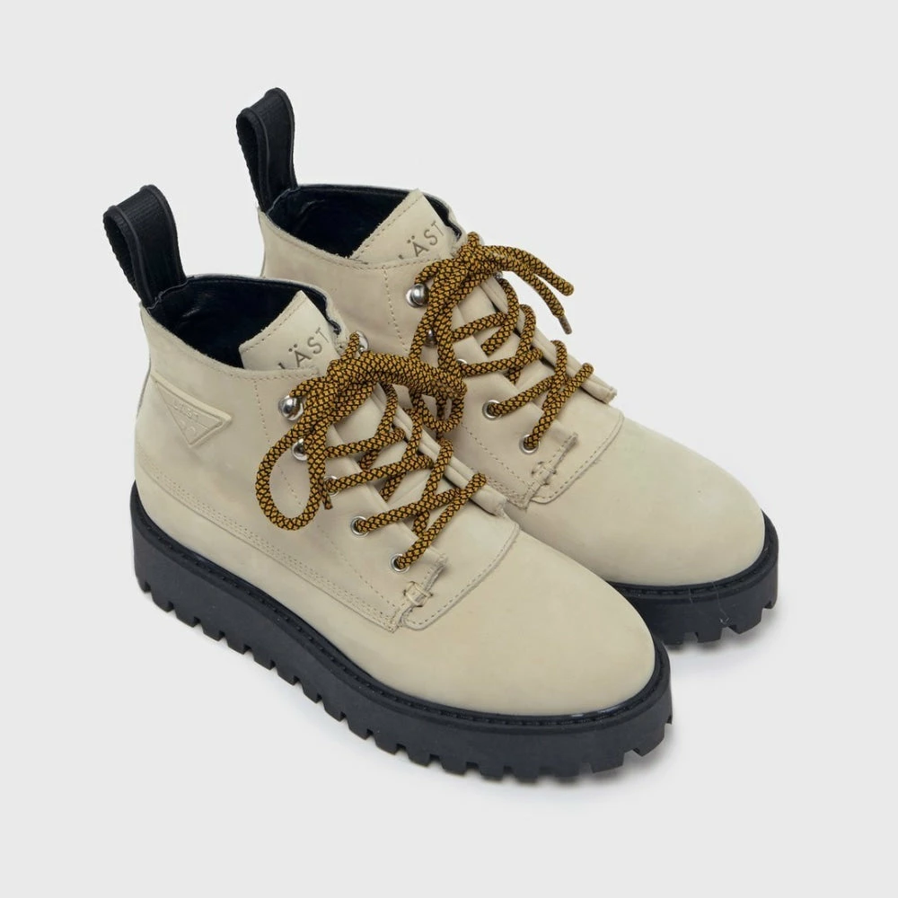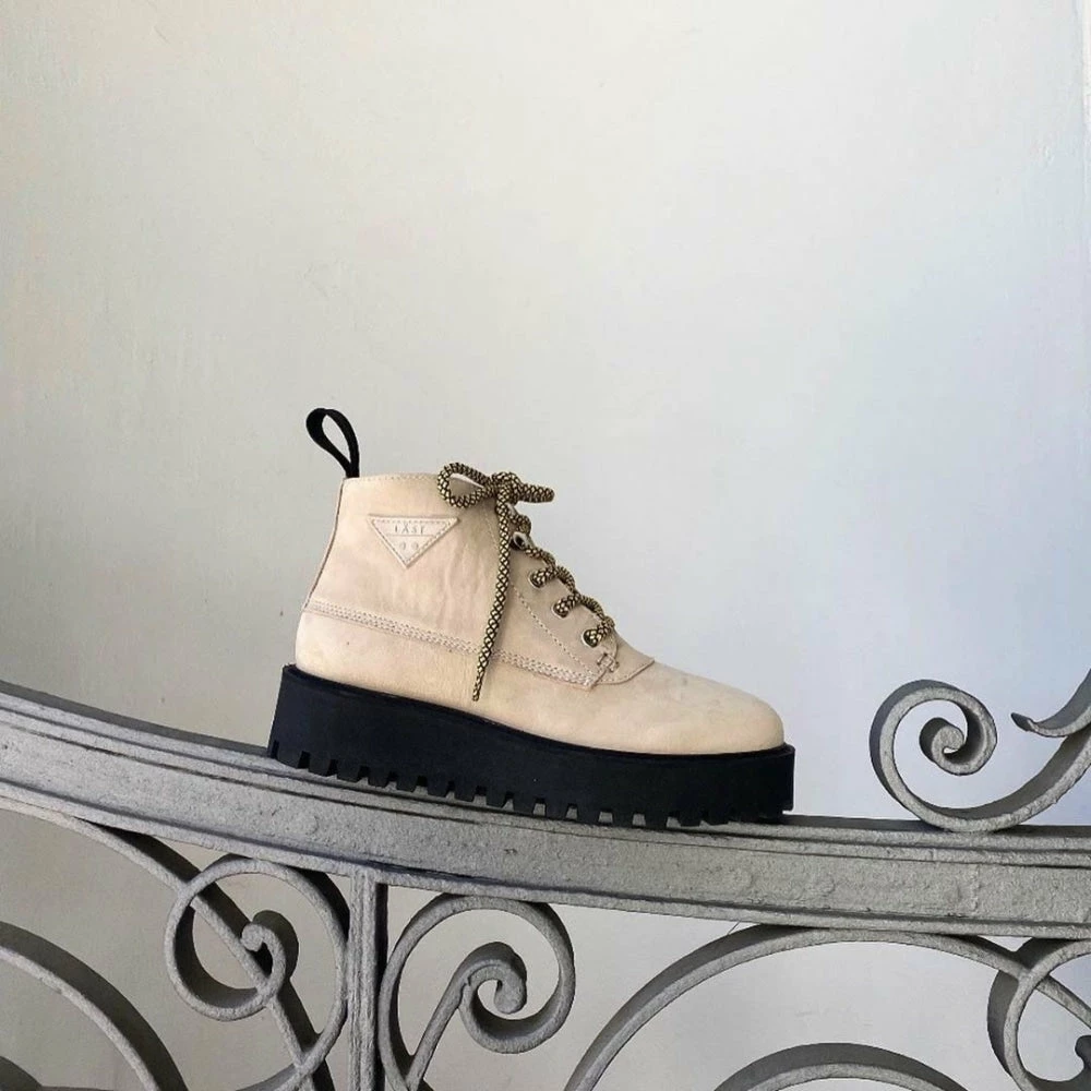 The upper beige material in soft premium Italian nubuck and lining in 100% leather. Removable insock in shock-resistant foam. Finished with their signature slip-resistant rubber sole in a towering platform with black stitching. Branding details consists of LÄST gross grain back strap with rubber molded logo, LÄST rubber triangle stitched to the shaft, LÄST logo embossed on the tongue and LÄST logo printed on the sock.