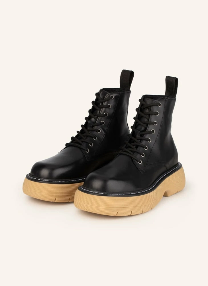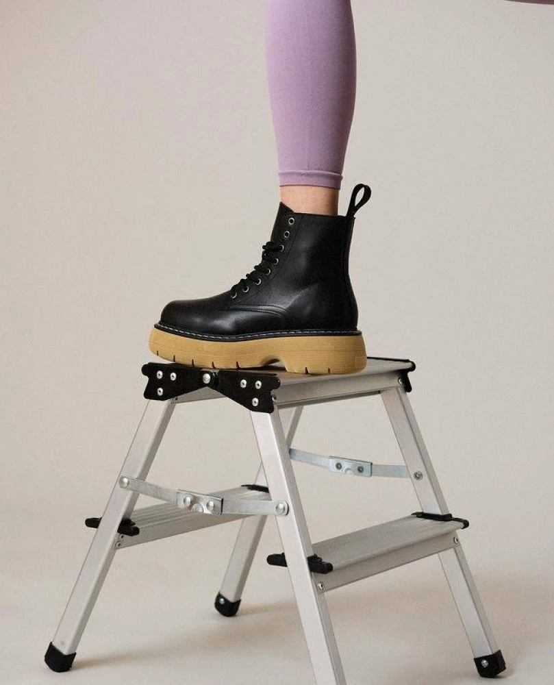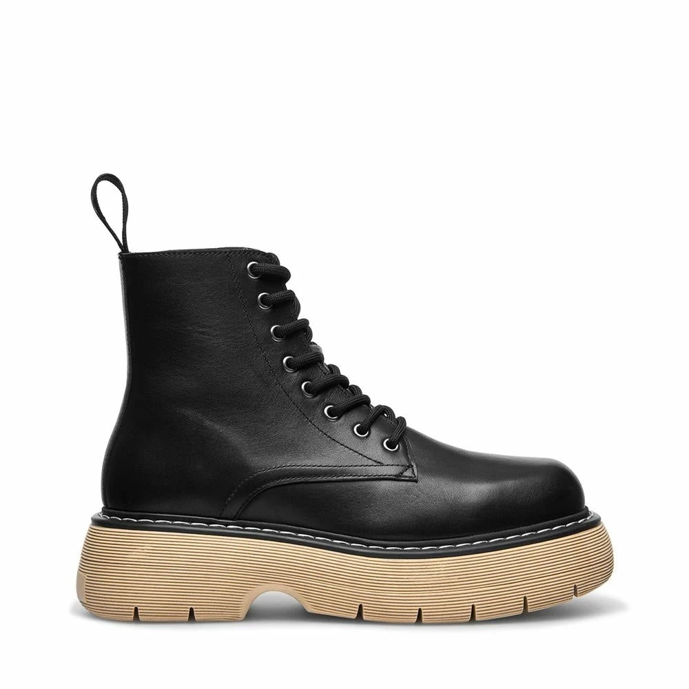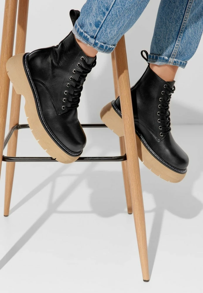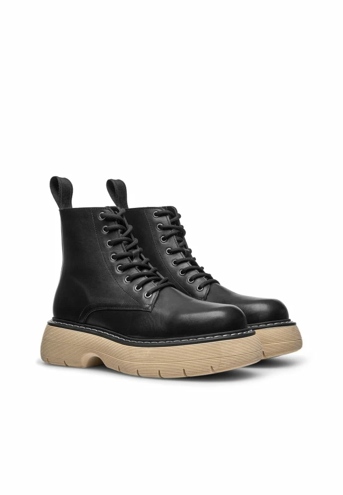 These luxuriously comfortable boots feature a rounded toe, leather upper with lace-up fastening, pull loop on the back, and an oversized flared rubber platform. The chunky beige platform contrasts with the black upper and is an eye-catcher. The genuine leather lining along with soft leather removable insoles render comfort and durability to the boots.