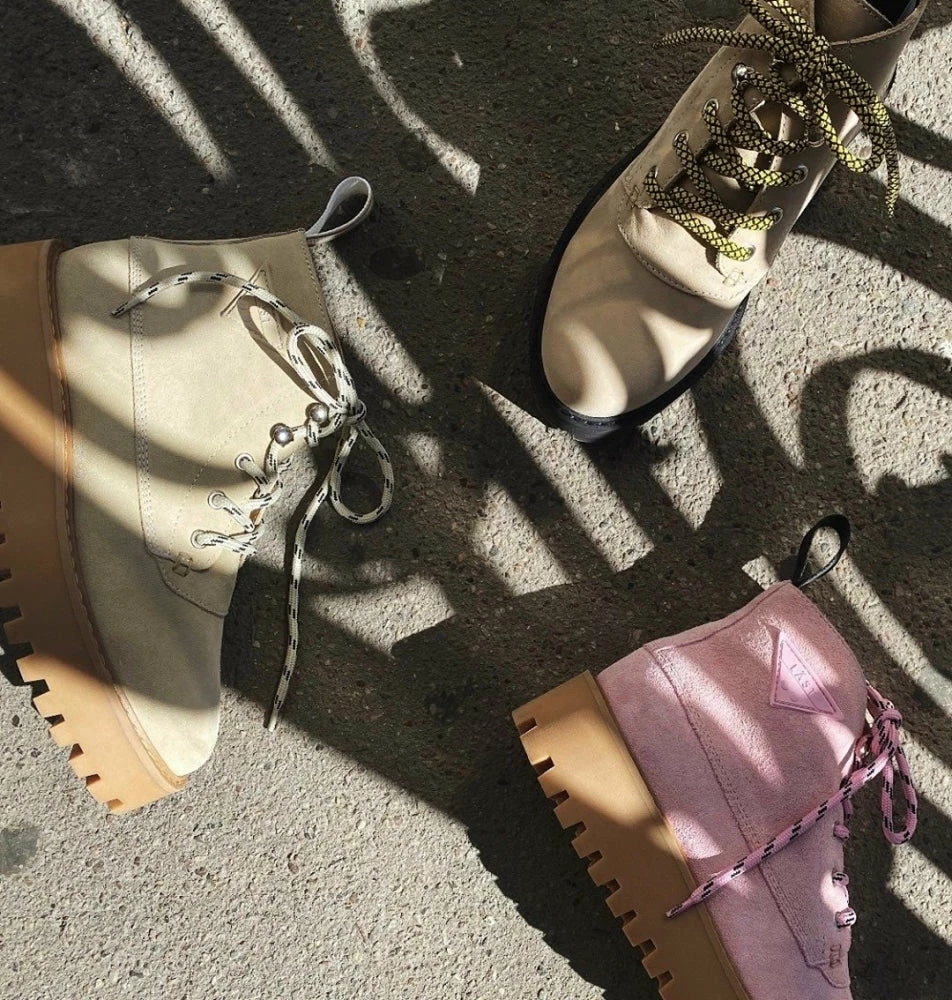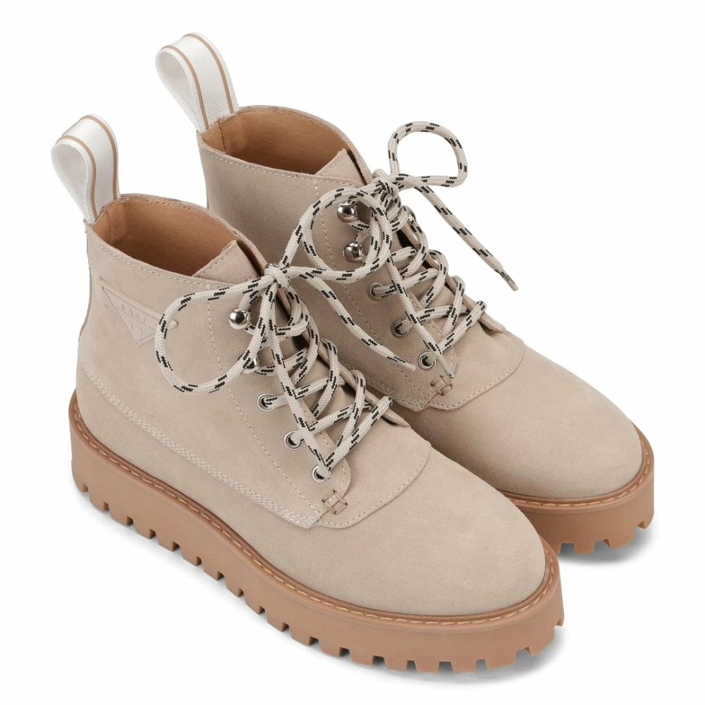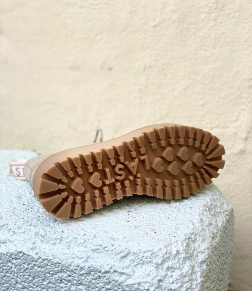 Rocky Suede Beige by LÄST. An icon 8-eye combat boot reimaged. This updated sole platform work boot with colorful laces is the perfect stylish street flat platform ankle boots.