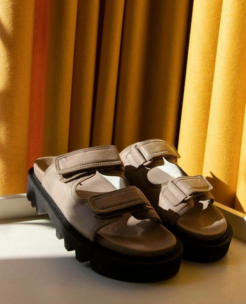 | Brand Model Product number Category Color Upper Material Food Bed Outsole Closure Made in | LÄST TEMPO LAST1275 Sandals Taupe Smooth Leather Smooth Leather EVA Velcro Straps Portugal |