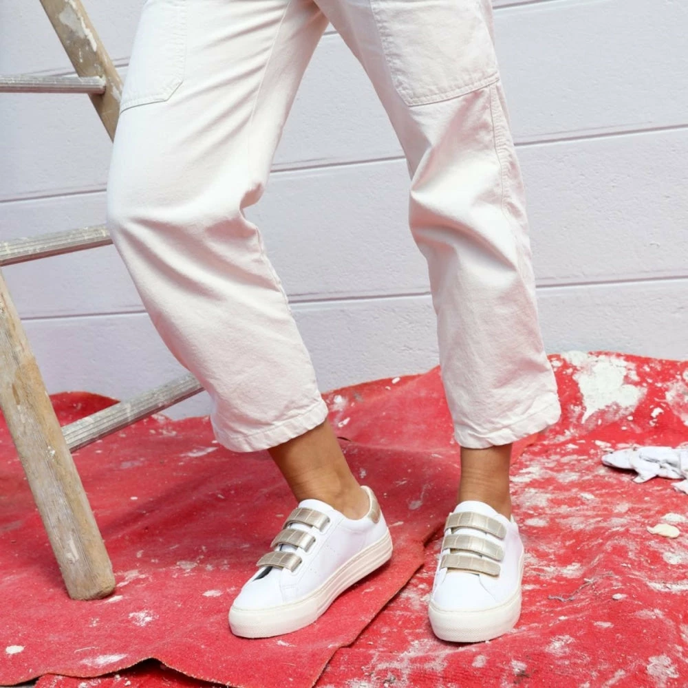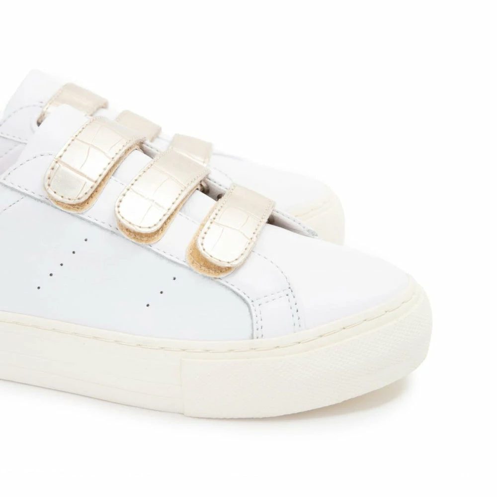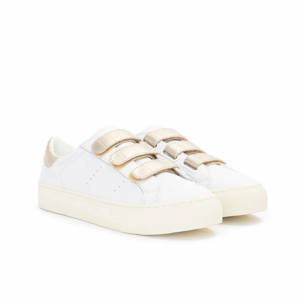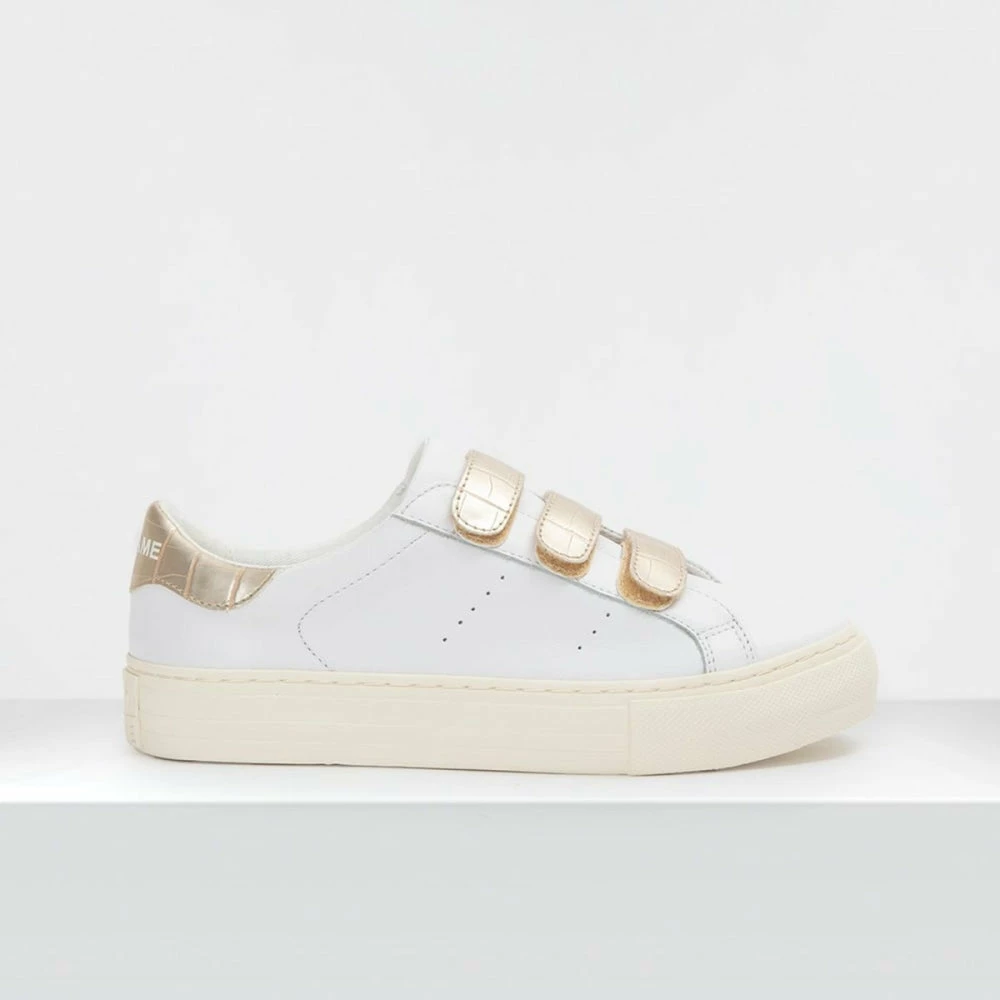This season NO NAME’s flat sneaker is back with a golden twist. True to the original design, the ARCADE STRAPS has a smooth white leather upper with perforations on the quarters, enhanced by golden metallic inserts.