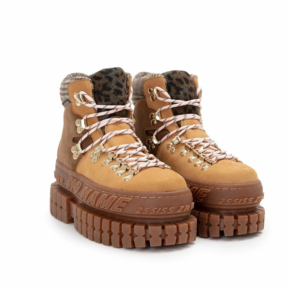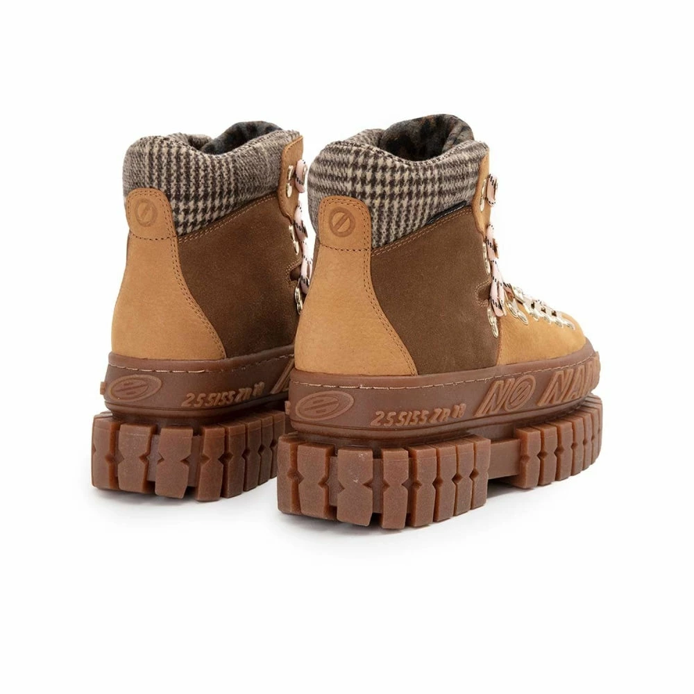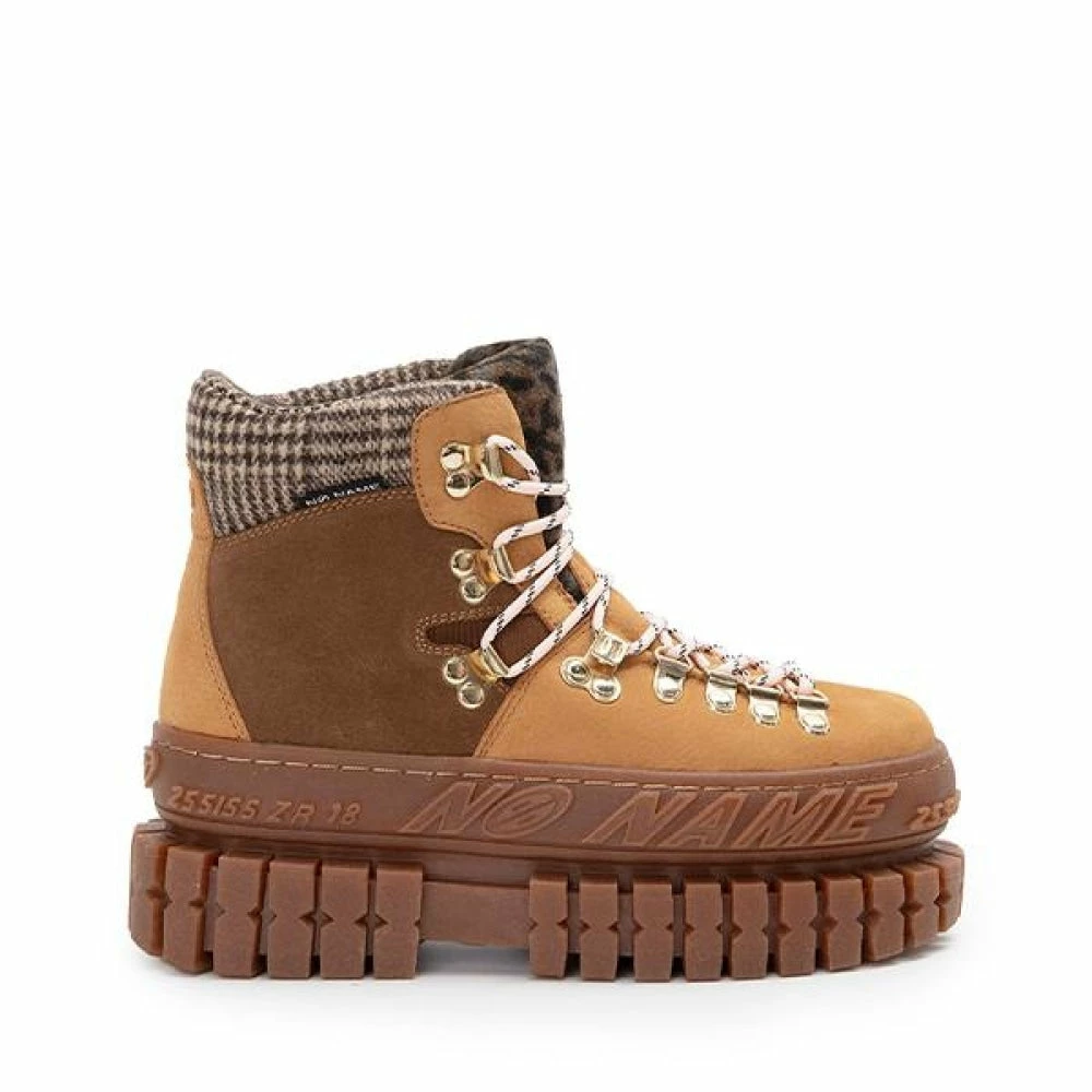 The ‘Hiker Trek’ boot from ‘No Name’ is a perfect track boot to go hiking or go out for casual evenings. A stylish boot in the tracks category, they feature a smooth leather and suede upper, metal hooks with a hiker-style lace fastening, a padded tartan collar, a leopard print felt tongue, and a stylish platform with a 7.5 cm heel.
