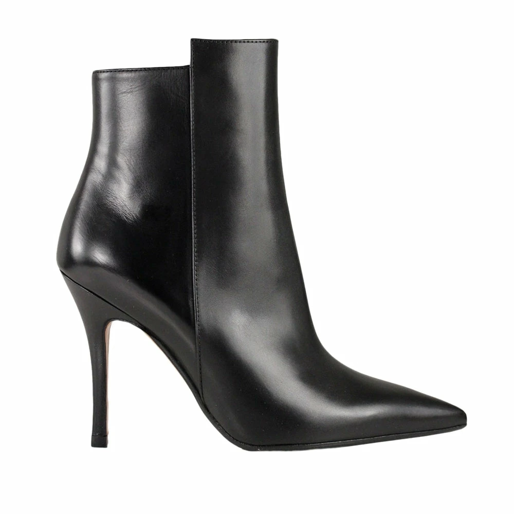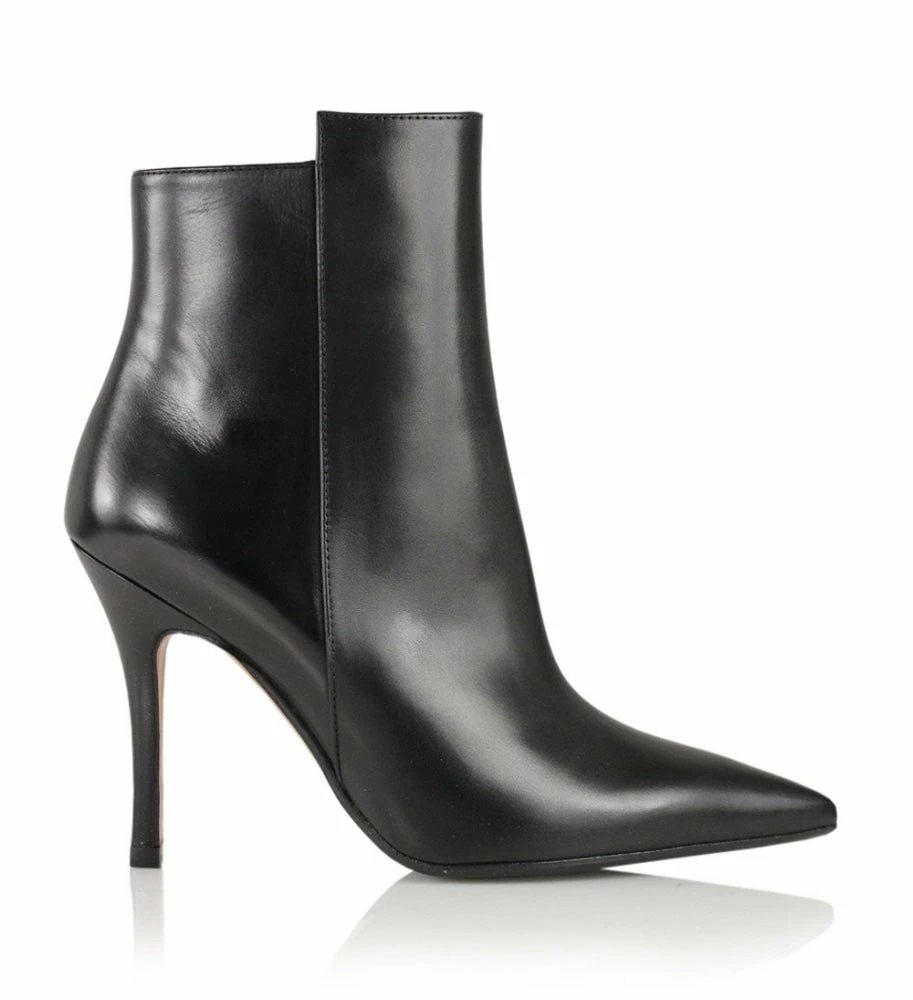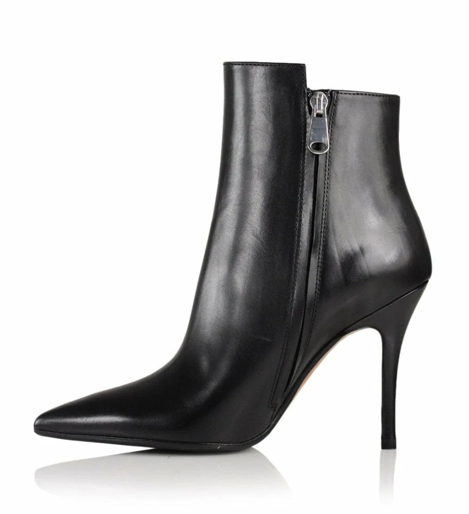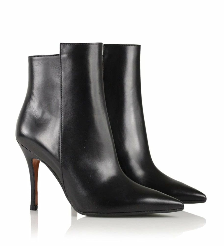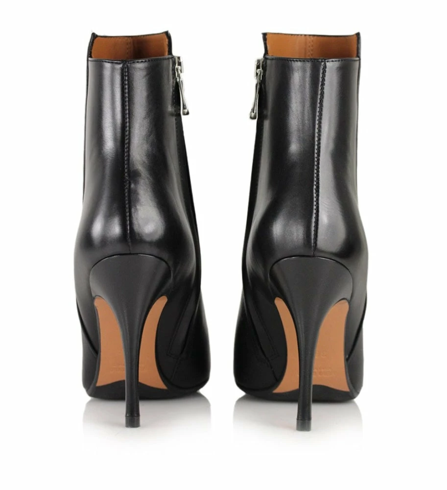 Black ankle boot crafted from smooth leather with a pointed toe, a high stiletto heel and a zip-fastening along the inner side. The boot has a slightly elongated front piece, which gives a twist to the otherwise classic silhouette.