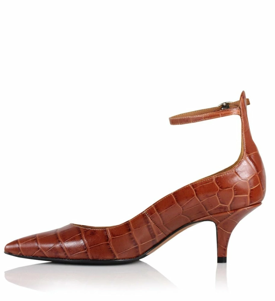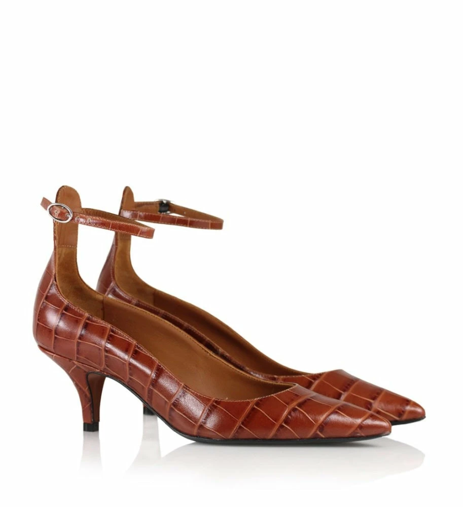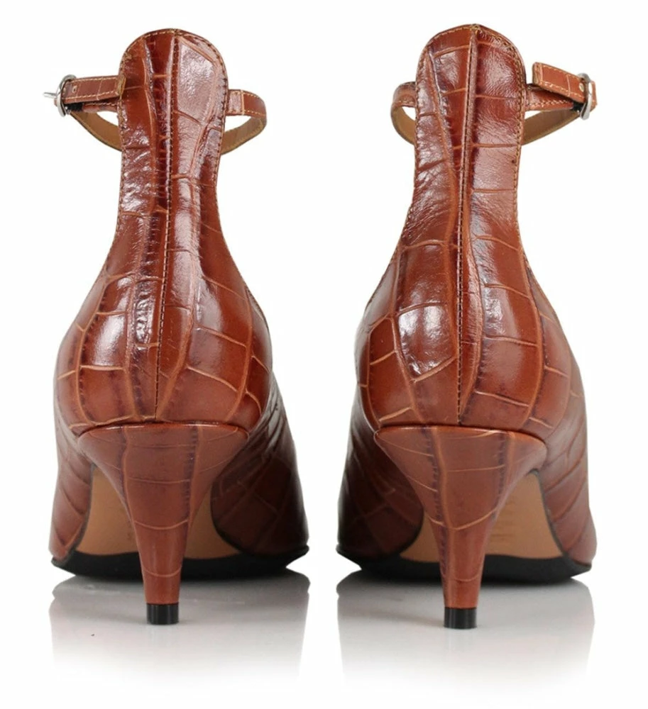 Brown pump crafted in smooth crocodile embossed leather with a pointy toe and a stiletto heel. Furthermore the pump has a feminine ankle strap which is closed with an oval silver buckle.