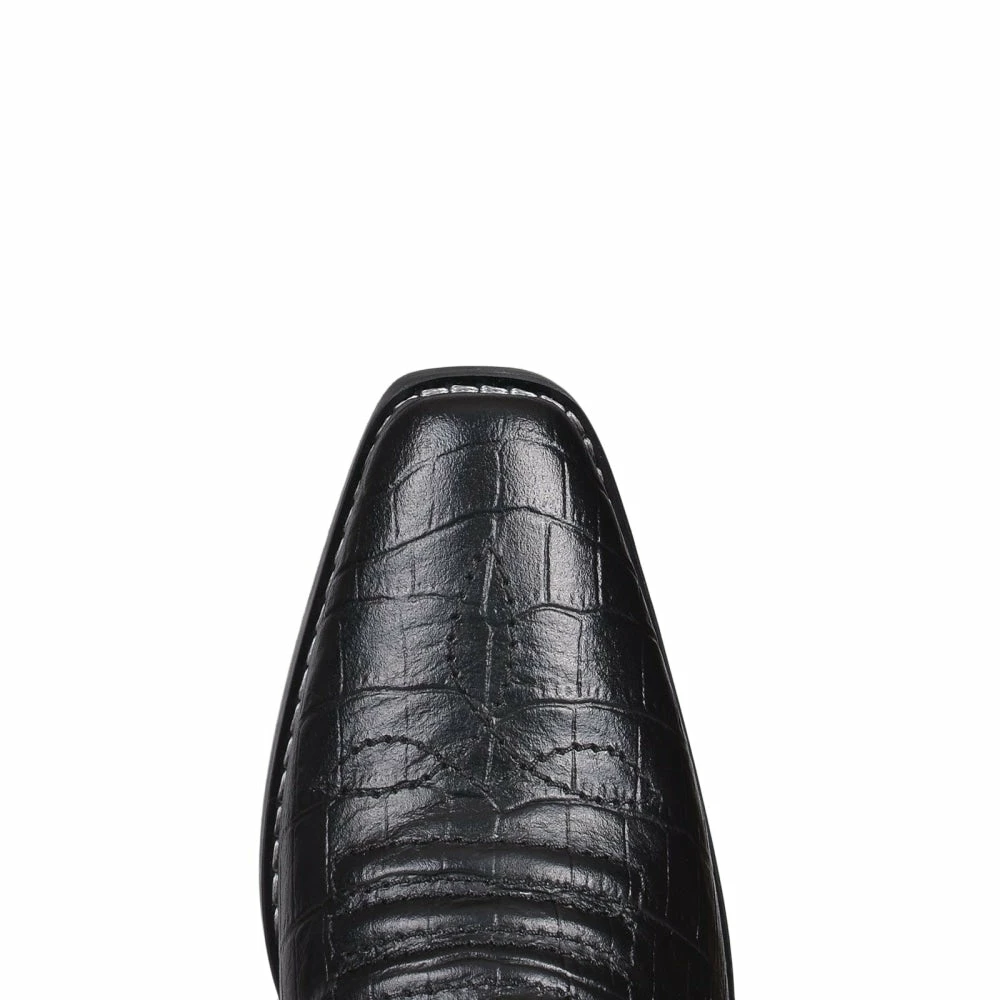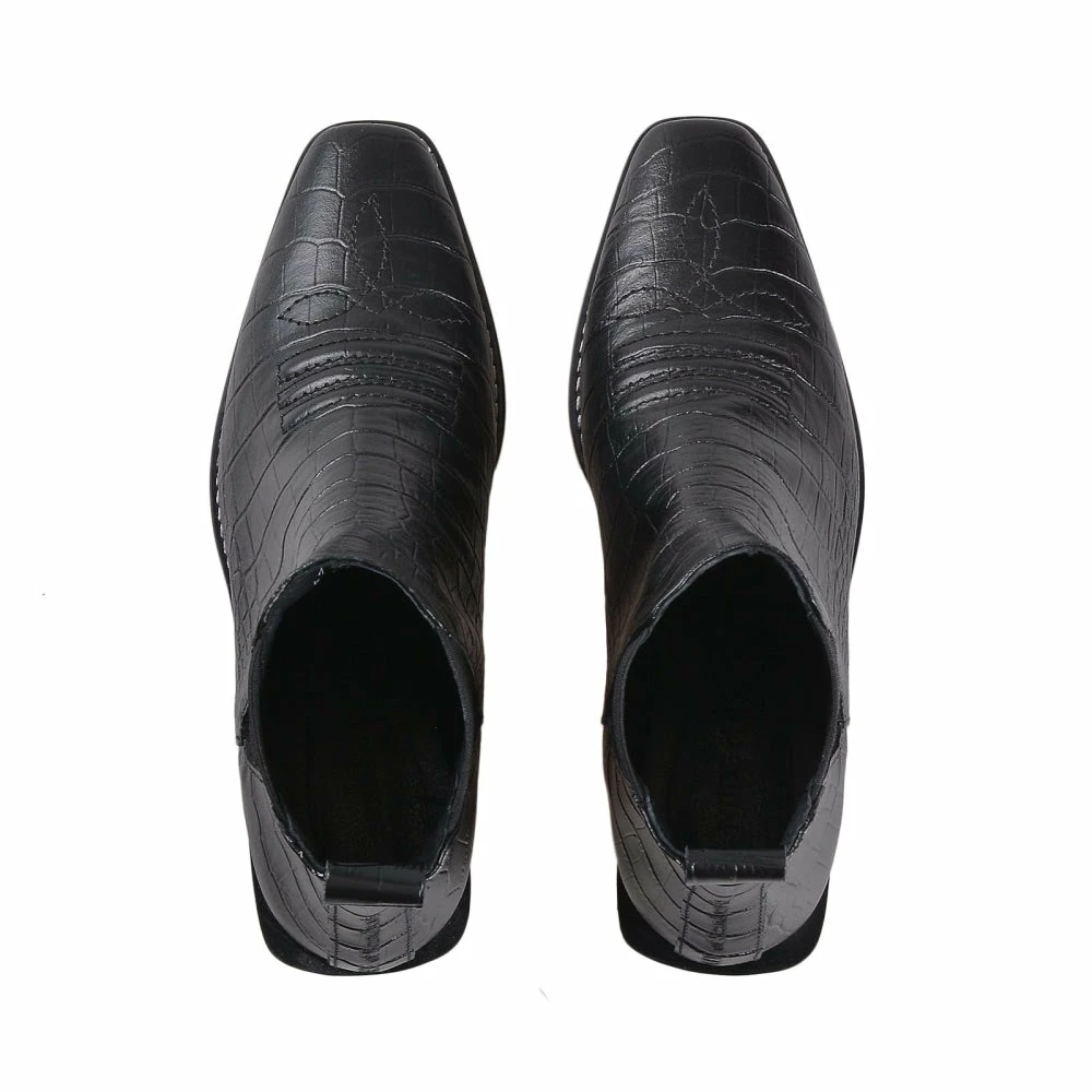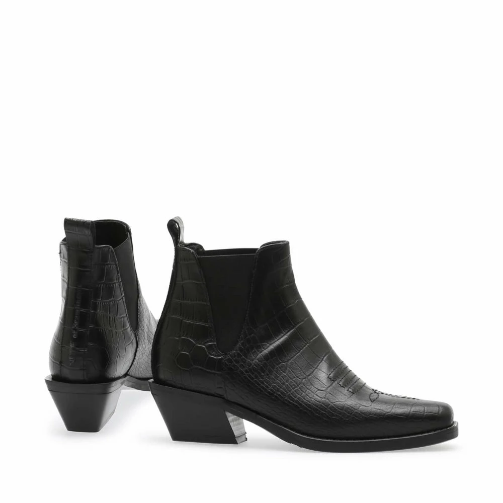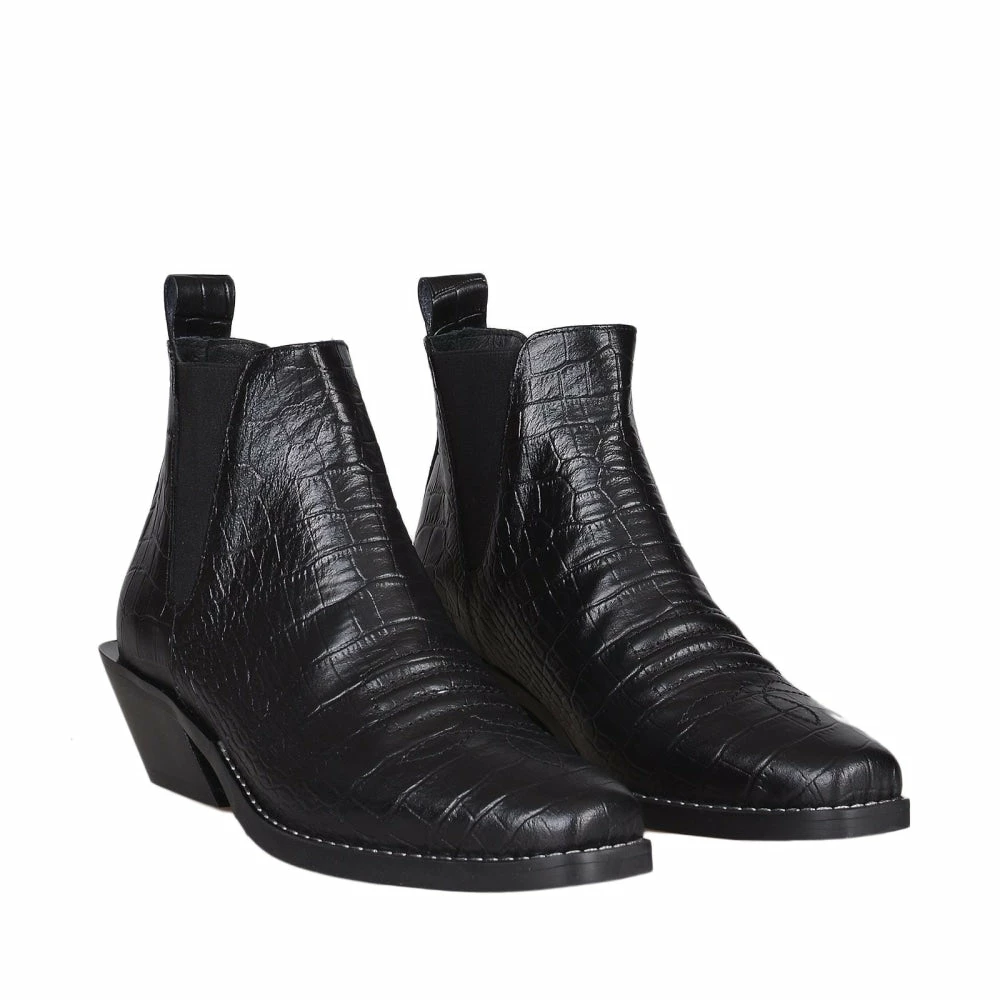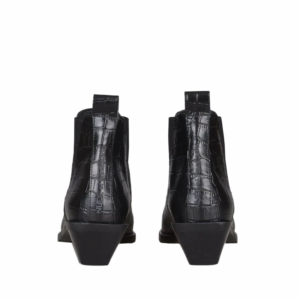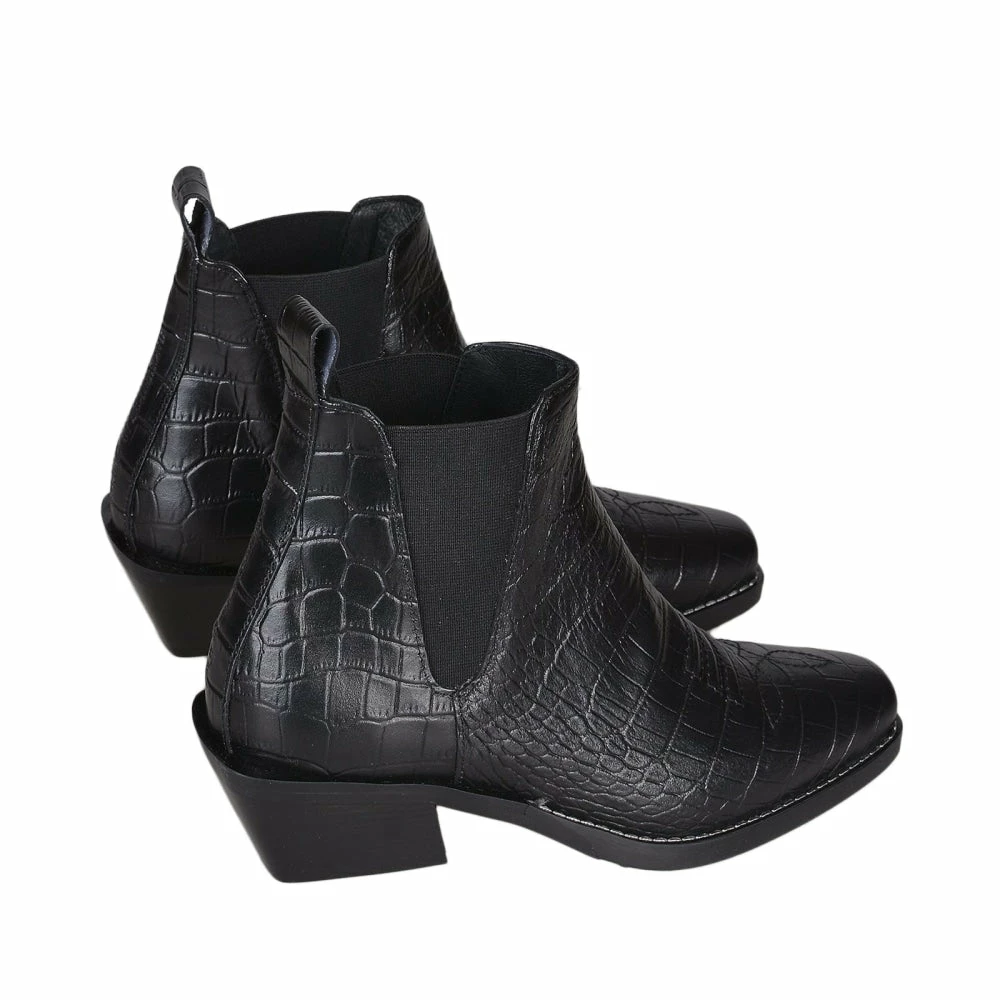 Panelled croco look boots from Nude of Scandinavia. Leather construction with a pointed toe. Finished with a stacked heel.