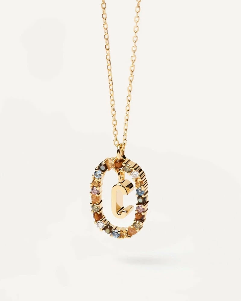 Labradorite, Tiger Eye, Mother of Pearl and crystals blend in a bright squarish oval that saves your initial like a treasure, giving life to a necklace design that will become the timeless icon of your own. Like floating in the air, an 18k gold plated initial hangs inside the amulet, a prominent piece made of 925 silver as your ultimate bold statement. Surrounding color hues and veins in the natural gemstones are singular characteristics in each necklace, making every letter genuinely unique in the world.