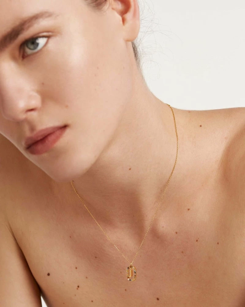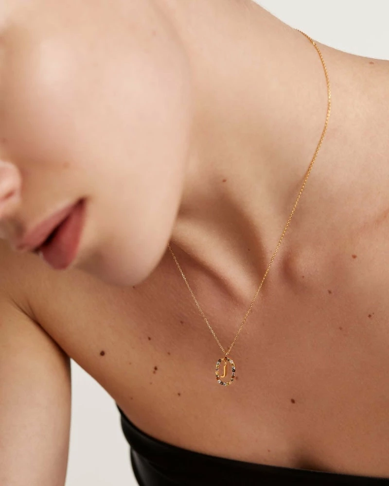 Labradorite, Tiger Eye, Mother of Pearl and crystals blend in a bright squarish oval that saves your initial like a treasure, giving life to a necklace design that will become the timeless icon of your own. Like floating in the air, an 18k gold plated initial hangs inside the amulet, a prominent piece made of 925 silver as your ultimate bold statement. Surrounding color hues and veins in the natural gemstones are singular characteristics in each necklace, making every letter genuinely unique in the world.