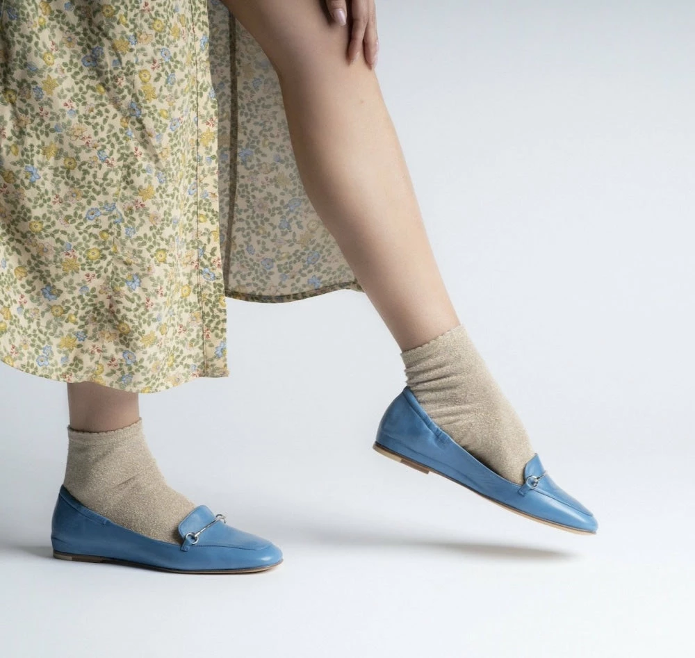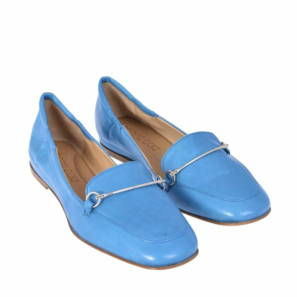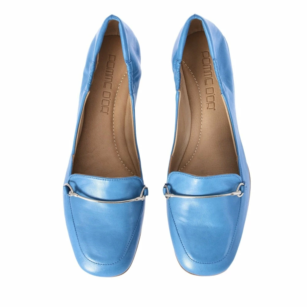 | Brand Model Product number Category Color Decoration Material Lining Outsole Heels Handmade | POMME D’OR Lena 1144PUNICE Flats Light Blue Silver horsebits on front 100% Extra Soft Leather 100% Leather 100% Leather Short Raised Heels in Italy |
