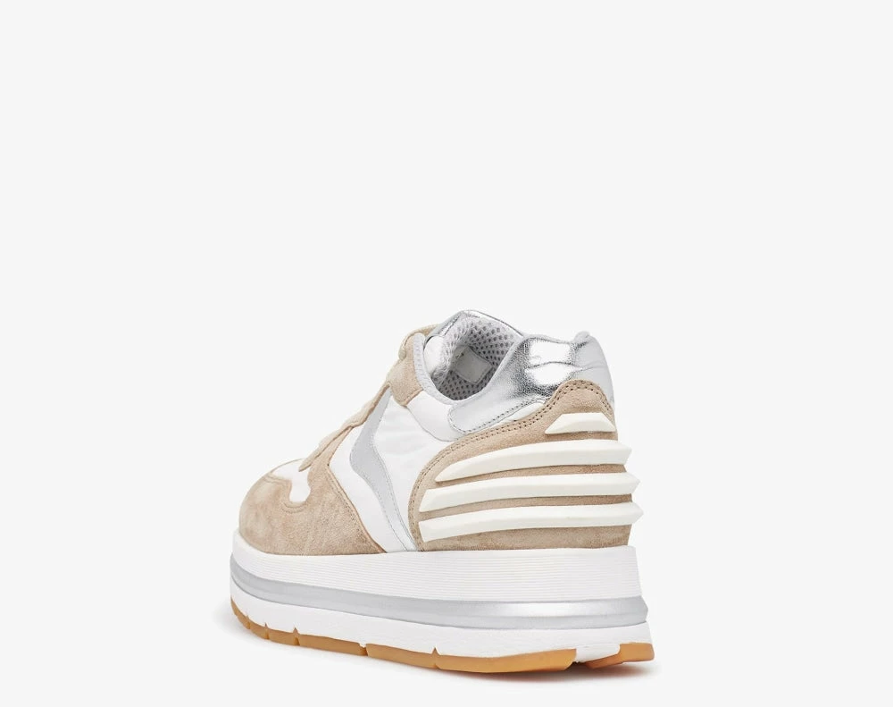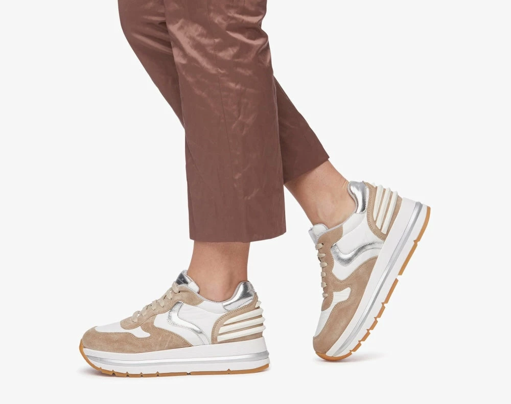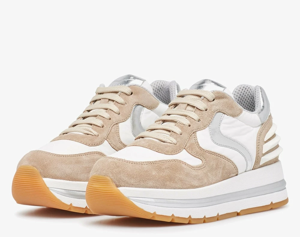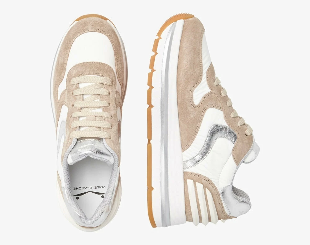 | Brand Model Product number Category Color Material Lining Outsole Made in | VOILE BLANCHE Maran Power 2015753081E05 Sneakers Beige Suede Leather Leather Double height ultra light rubber sole Italy |