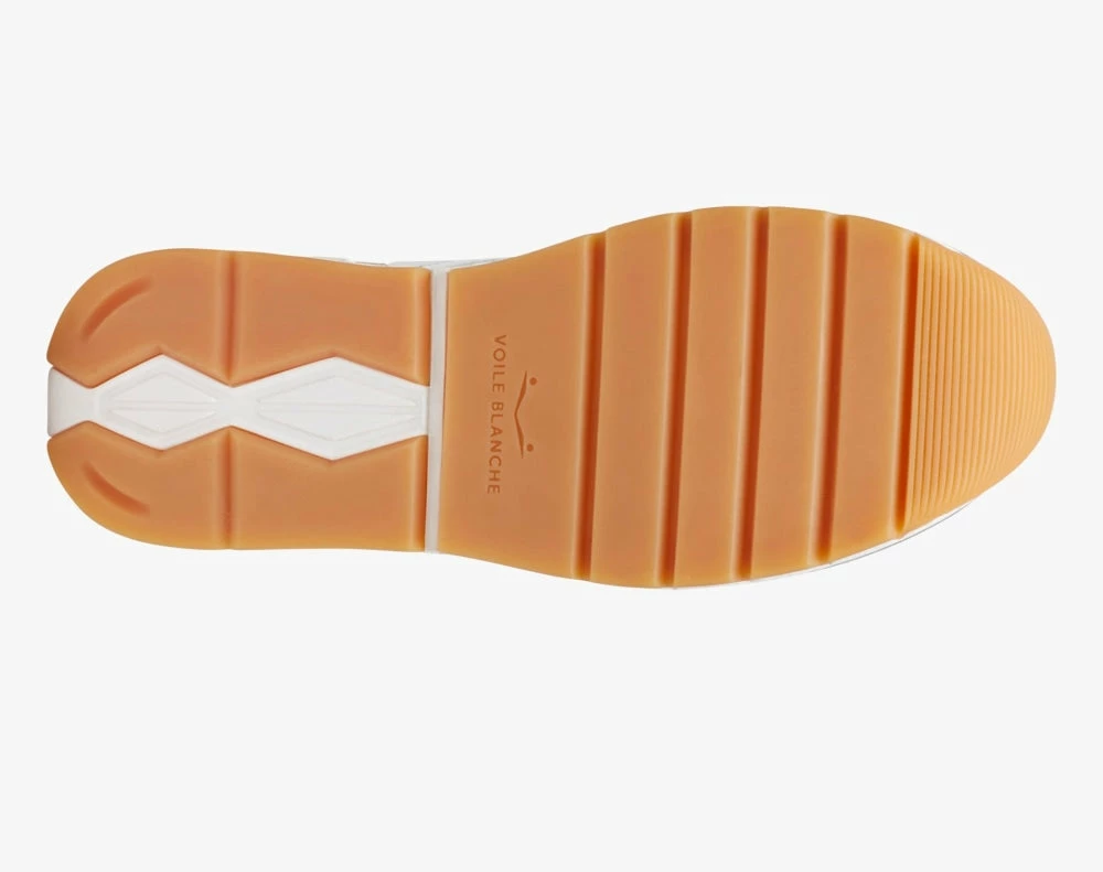 The upper combines elements in suede and soft-touch technical fabric with a fancy fabric tray with a lurex thread. The side logo and mirror-finish heel-tab complete the design. The heel-tab is also enriched by three-dimensional rubber injections, an iconic Voile Blanche detail. Double-height ultra-light rubber sole.