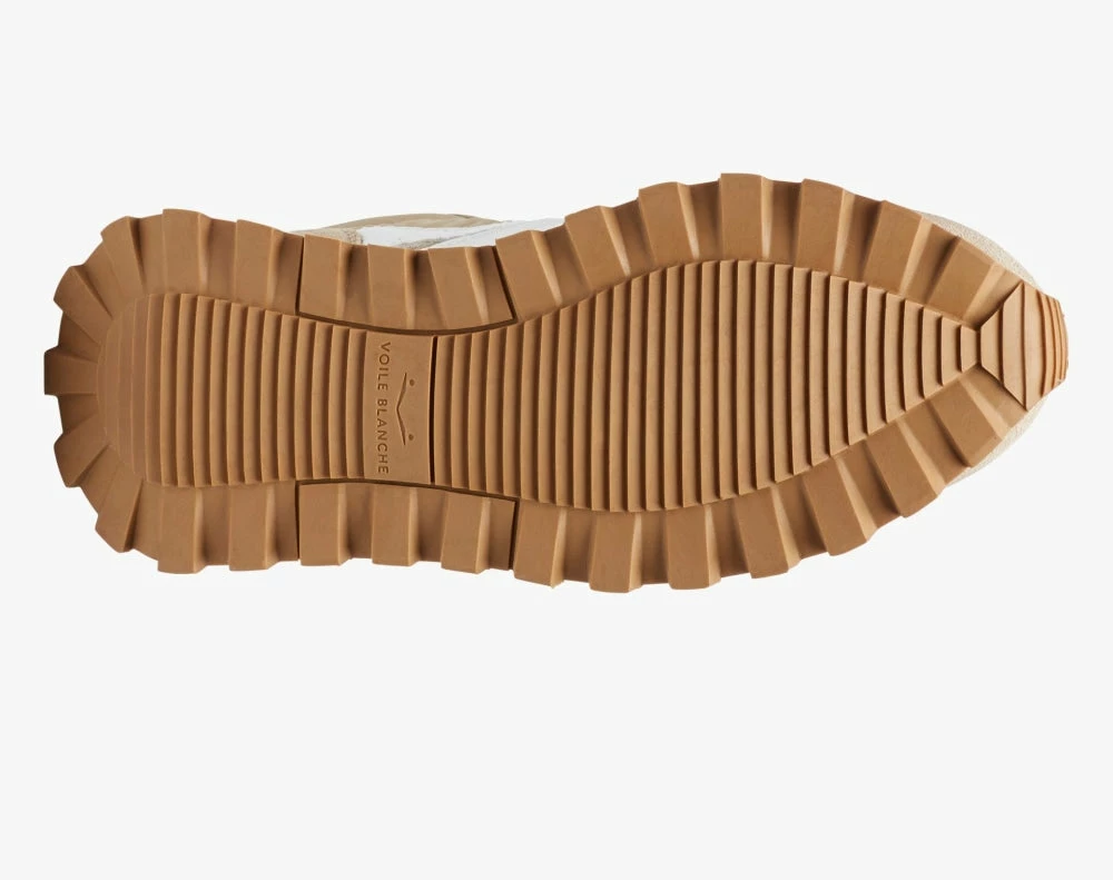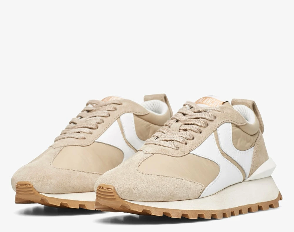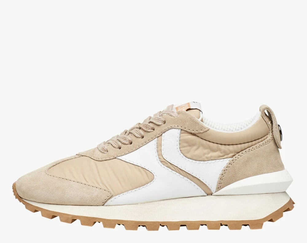 | Brand Model Product number Category Color Material Lining Outsole Made in | VOILE BLANCHE Qwark Woman 2015859020E01 Sneakers Beige Suede Leather Leather Dirt effect rubber sole with notched tread Italy |