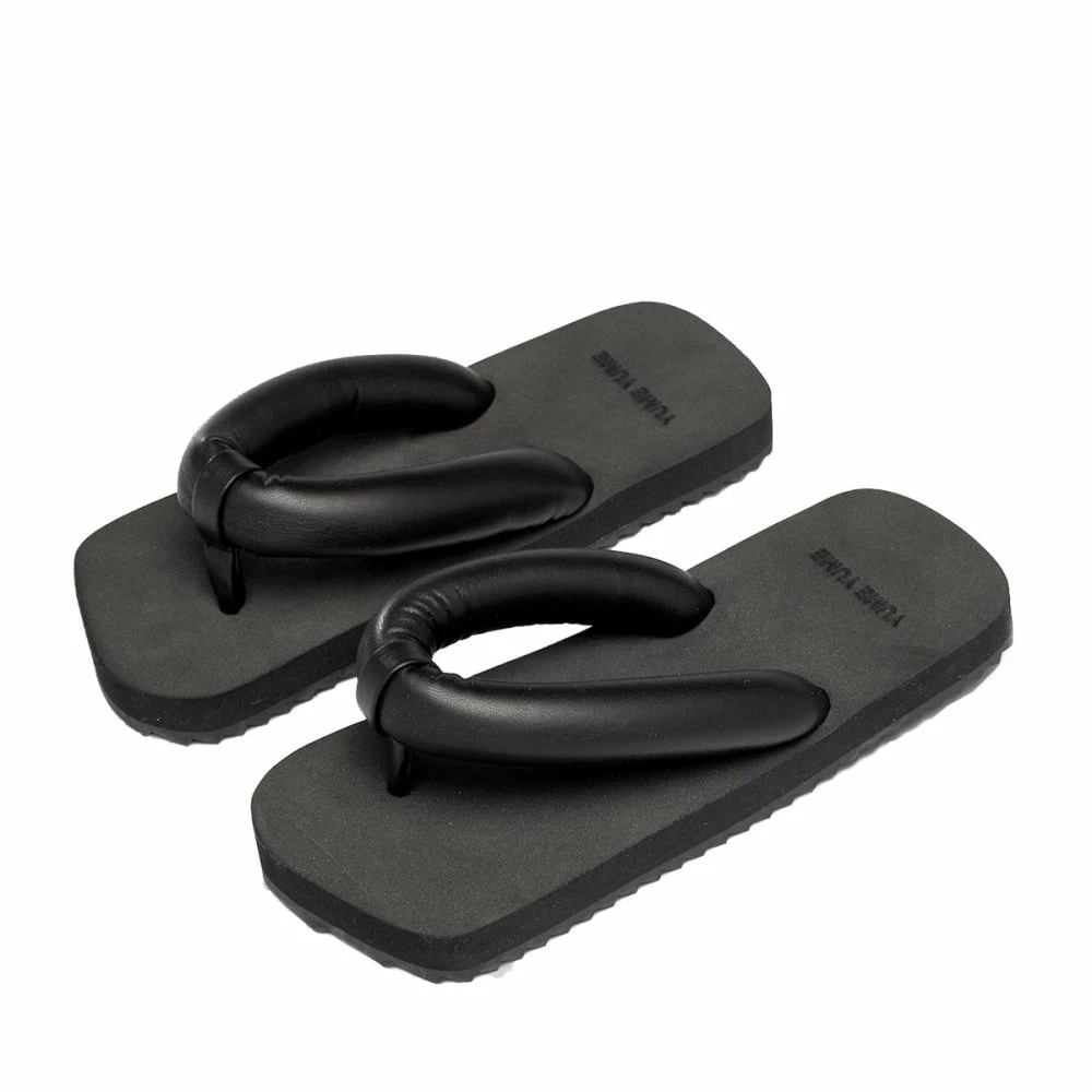 These flip flops are inspired by the iconic Japanese Geta shape. Its traditional wood has been replaced with high quality EVA foam. The upper is made from Italian vegan leather