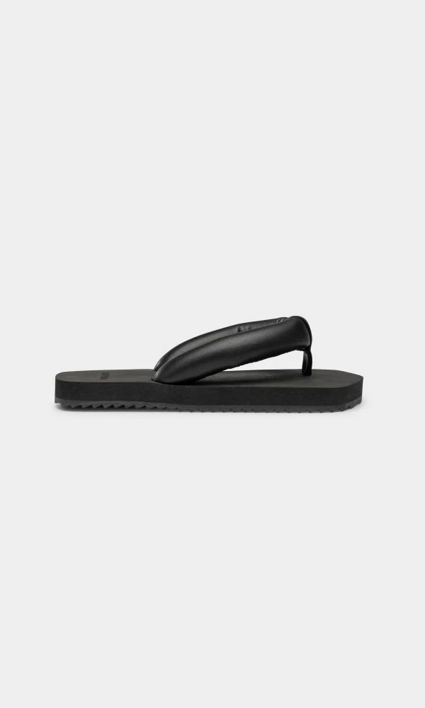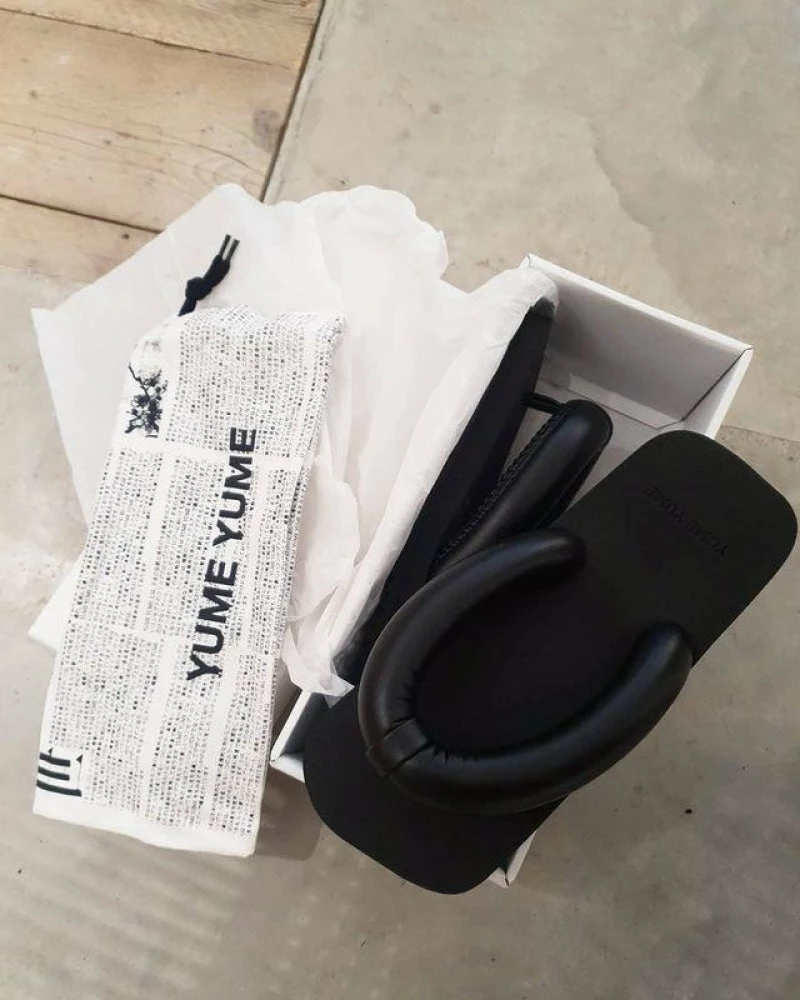 | Brand Model Product number Category Color Material  Outsole   Packaging Made in | YUME YUME Suki PF0002 Flip Flops Black Vegan Leather  29% Bamboo 19% Cotton, 52% PU Lightweight and Durable EVA 80% Durable EVA 20% TPU 100% Recycled Biodegradable Carton Portugal |