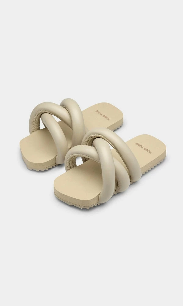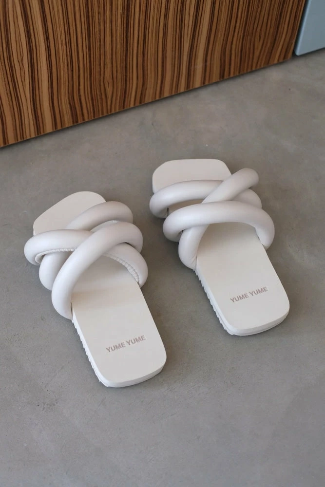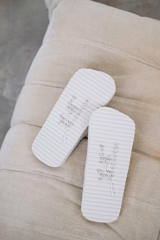 | Brand Model Product number Category Color Material Outsole Made in | Yume Yume Tyre Slide TS0008 Sandals Beige Vegan Leather 80% Durable EVA, 20% TPU Portugal |